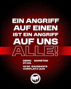 Heute waren unter dem Motto “Getroffen hat es einen, gemeint sind wir alle” insgesamt um die 100 Antifaschist*innen in Ulm auf der Straße. Wir zogen mit einer lauten und kraftvollen Demo vor den Infostand der AfD Ulm, eben jener Infostand von dem der feige rechte Angriff am 28.02. ausging. Zu Beginn der Demo versuchte sich der Ulmer AfD- Gemeinderat und langjähriger Aktivist der Identitären Bewegung… Read more: 07.03.26 – Rückblick zur “Getroffen hat es einen, gemeint sind wir alle” Demo - Ein Angriff auf einen ist ein Angriff auf uns alle