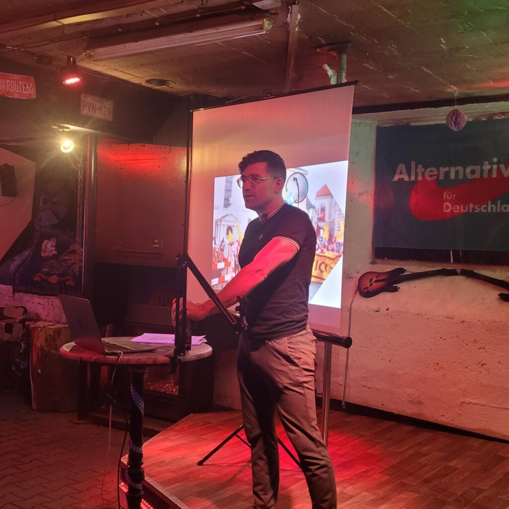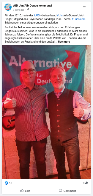 Am Tag vor dem Sellner Vortrag stand Daniel Rottmann auf der gleichen Bühne. Der andere Teil des neuen Ulmer Gemeinderats-Duos der AfD hatte dort einen internen, nicht öffentlichen Vortrag durchgeführt. In dem Vortrag sprach Ulrich Singer, AfD Mitglied des bayrischen Landtages, über Russland.