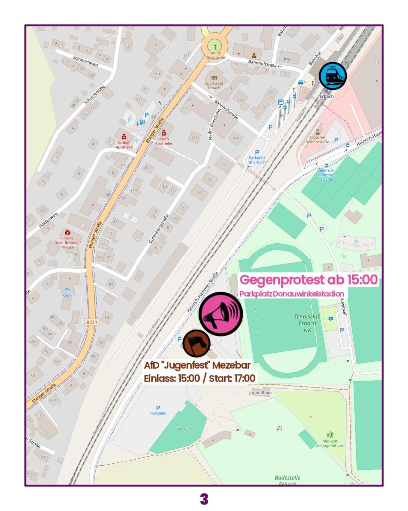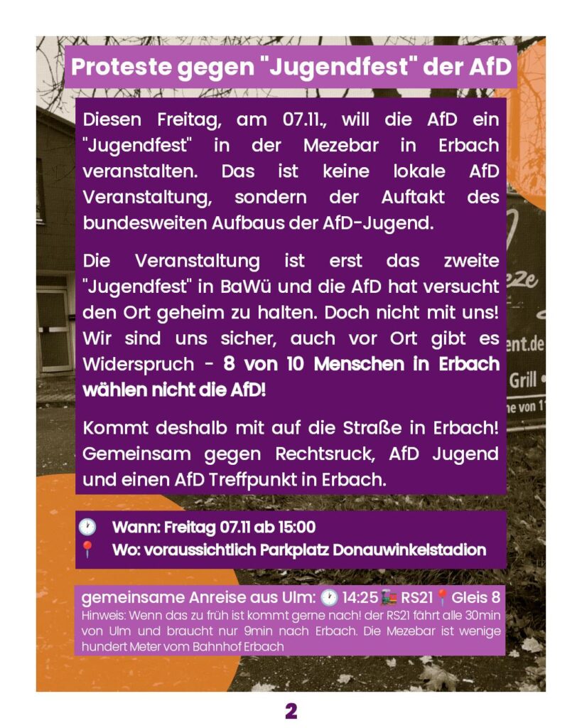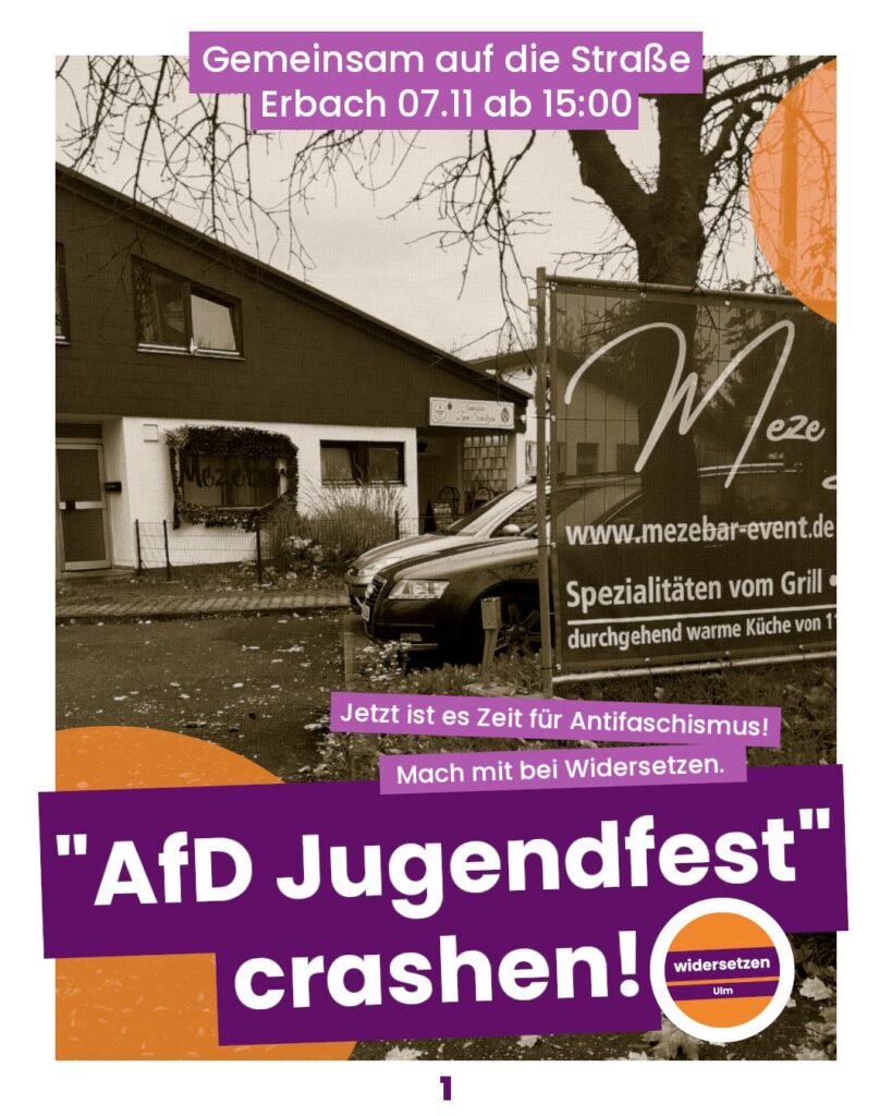 Die Veranstaltung ist erst das zweite “Jugendfest” in BaWü und die AfD hat versucht den Ort geheim zu halten. Doch nicht mit uns! Wir sind uns sicher, auch vor Ort gibt es Widerspruch – 8 von 10 Menschen in Erbach wählen nicht die AfD!