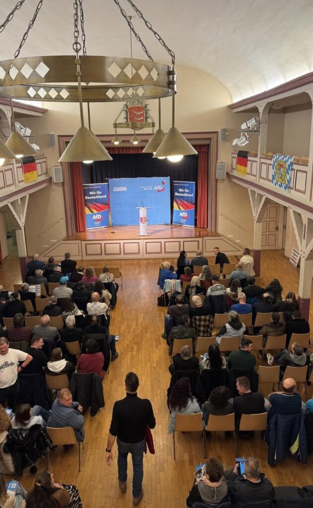 Die Polizei gibt wie so oft faktisch fragwürdiges von sich, und spricht in der Augsburger Zeitung von 200 auf der Demo und 150 in der Halle – wir haben mit mehreren Personen vor Ort gesprochen, am Eingang mitgeschaut und die AfD Bilder ausgewertet. Die 150 in der Halle stimmen niemals, wir schätzen eher um die 80-90 Leute.