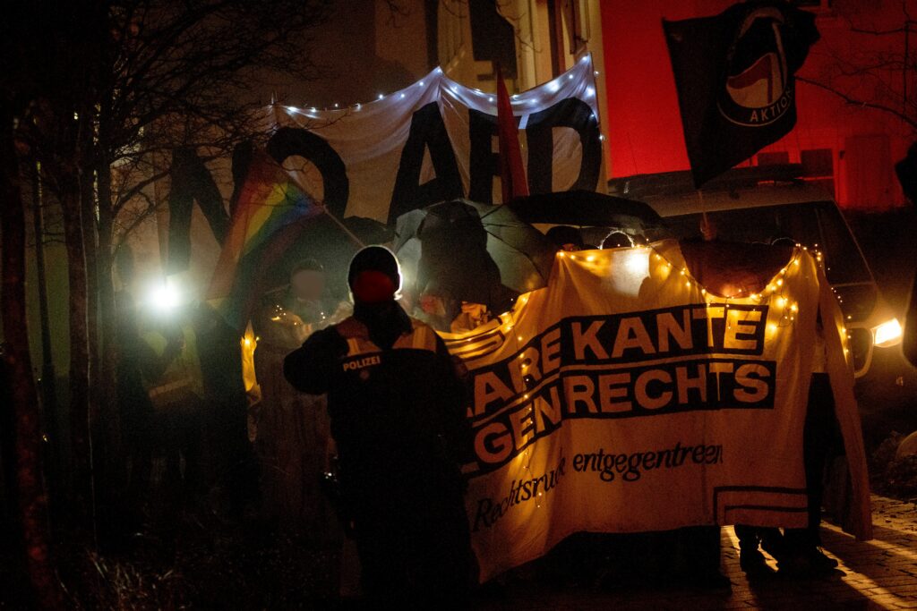 Wie bereits bei den zwei anderen Protesten gegen AfD Veranstaltungen in der Stadthalle, war der Großteil der Teilnehmenden nicht angereist, sondern vor Ort. Etwas das die AfD gerne verdreht und für sich in Anspruch nimmt. Ein Blick auf die andere Seite der Gitter zeigt aber was anderes – und zwar eine ganze Menge reisefreudiger extreme Rechte.
